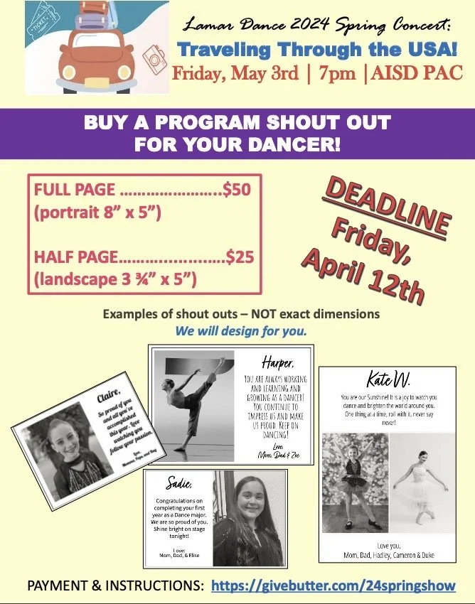 Last Day to purchase A program shout out for spring show! Friday, April 12, 2024 11:00 PM 11:59 PM 23:00 23:59 Lamar Middle School 6201 Wynona Avenue Austin, TX, 78757 United States (map) Google Calendar ICS Today is the last day to purchase a program shout out for 2024 Spring show!!Click here to purchase now.